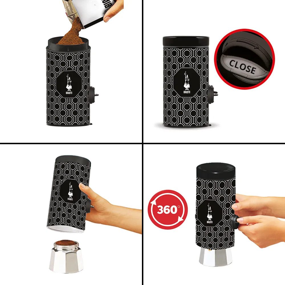 1-9 adagig a tárolót közvetlenül a Moka kávéfőzőre helyezve, gombját 360°-ban elforgatva adagolja a megfelelő mennyiségű őrölt kávét.