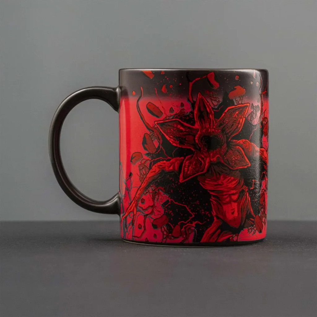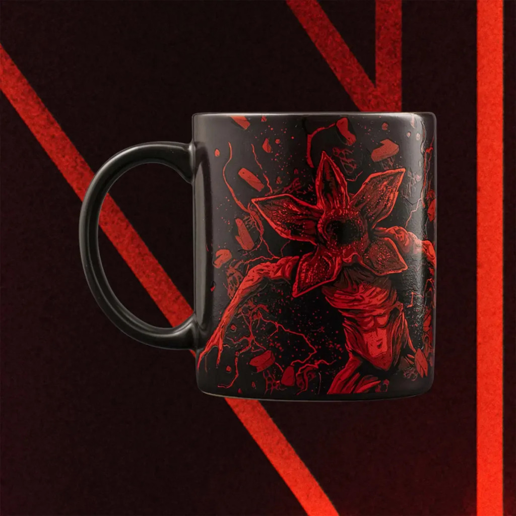 A hőérzékeny hatás rendkívüli. A kerámia hővel érintkezve megváltozik, feltárva az Upside Down ihlette részleteket. A Stranger Things bögre kötelező darab. Hideg állapotban feketének tűnik, és a Demogorgon előbukkan. Öntsd bele kedvenc italodat, és az Upside Down ihlette részletek veszik körül.
