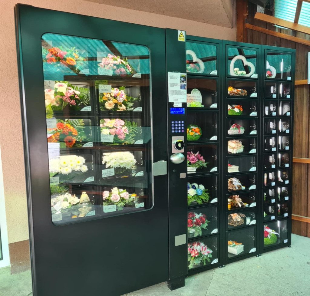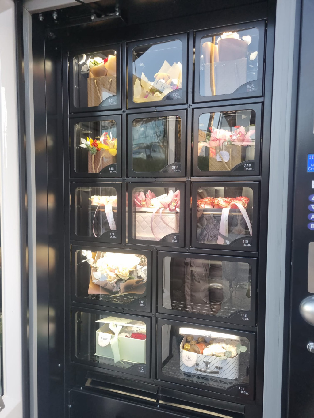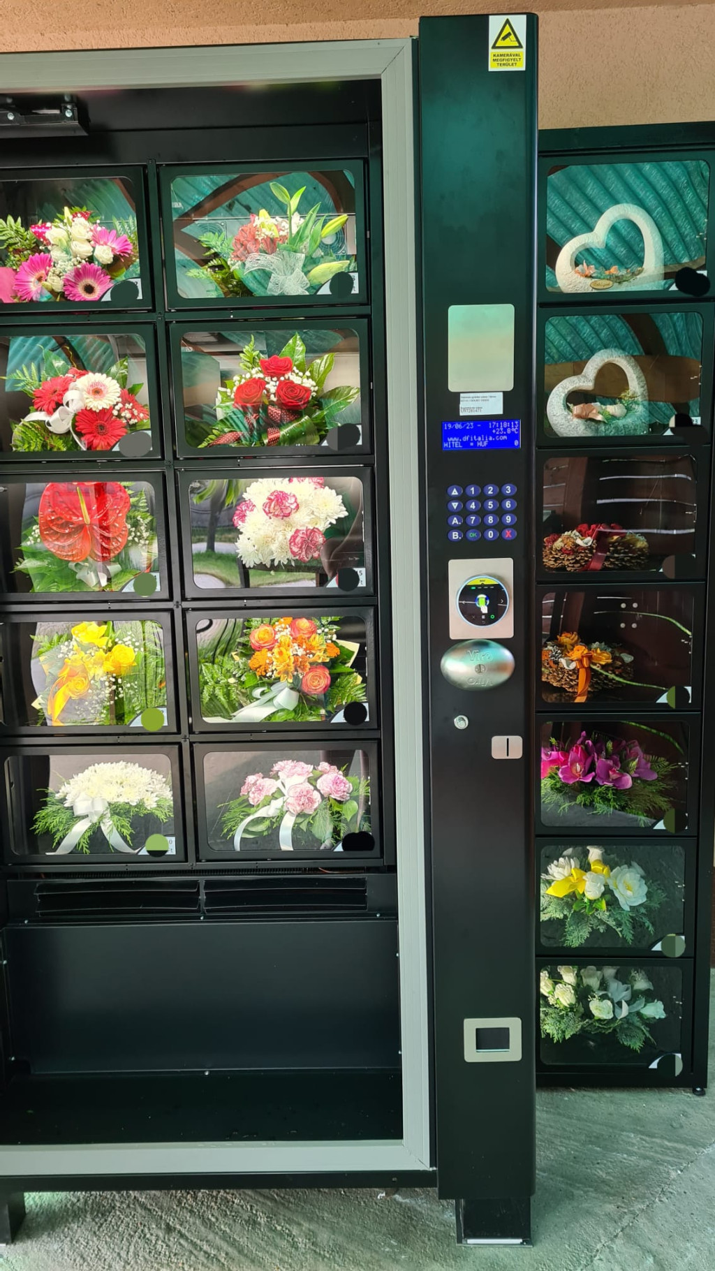 Ideális virágcserepek, különféle kompozíciók, akár nagy méretűek és csokrok teljesen automatikus értékesítéséhez: a gép speciális kialakításának köszönhetően a virágcsokrok és a tökéletesen tartósított növények értékesítéséhez vízzel töltött kúpos cserepek helyezhetők el a különböző speciális rekeszekben!